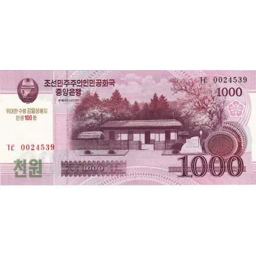 | Obverse lettering | 조선민주주의인민공화국중앙은행 위대한 수령 김일성 동지 탄생 100 돐 주체 97 - 2008 천원 (Translation: Central Bank of Democratic People`s Republic of Korea Great Leader Comrade Kim Il Sung 100th Birthday Juche 97 - 2008 One Thousand Won) |