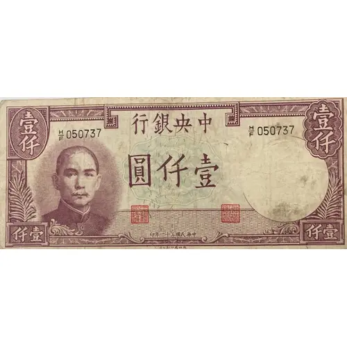 | Reverse lettering | THE CENTRAL BANK OF CHINA 1942 ONE THOUSAND YUAN |
