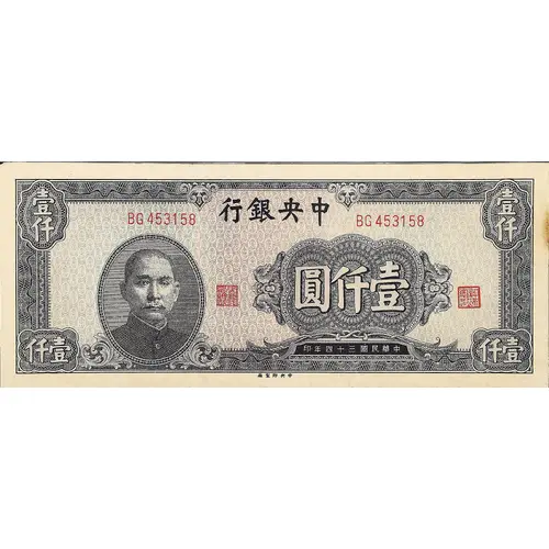 | Obverse lettering | 行銀央中 圓仟壹 印年四十三國民華中 (Translation: Central Bank of China One Thousand Yuan Printed in the 34th Year of the Republic) |