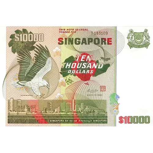 Obverse lettering THIS NOTE IS LEGAL TENDER FOR $10000 SINGAPORE TEN THOUSAND DOLLARS WHITE BELLIED SEA EAGLE MINISTER FOR FINANCE SINGAPURA 新加坡 சிங்கப்பூர் SINGAPORE $10000