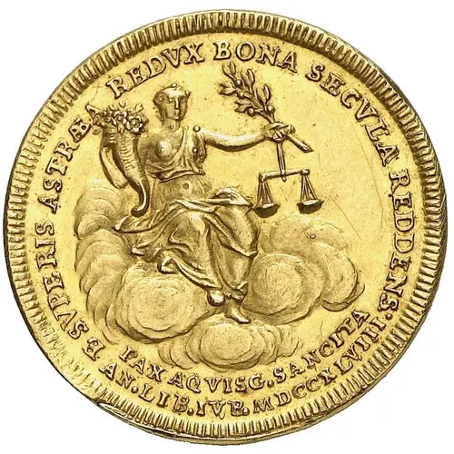 | Obverse lettering | PAX AQVISGR SANCITA AN LIP IVR MDCCXLVIII E SVPERIS ASTRAEA REDVX BONAS SECVLA REDDENS |