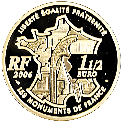 Map of France including various historical monuments with different types of architecture. The inscriptions are on both sides of the map. In clockwise order, at the top the motto `LIBERTÉ ÉGALITÉ FRATERNITÉ`, then `1 EURO 1/2`, at the bottom `LES MONUMENTS DE FRANCE`, the marks of the workshop, the year `2006` and finally `RF` of French Republic. |
