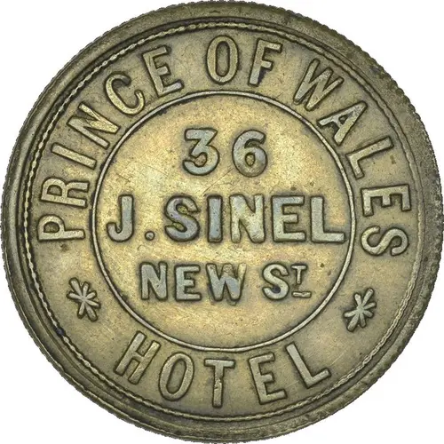 | Obverse lettering | PRINCE OF WALES 36 J. SINEL NEW ST. HOTEL |