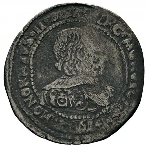 Historical Context: This 12 Gros coin, dated 1640, was issued under Honore II, a transformative figure in Monaco's history. His reign (1612-1662) marked a crucial transition from a Spanish protectorate to an independent principality under French influence. Though the Treaty of Peronne (1641) formalized this, the 1640 coinage reflects Honore II's burgeoning assertion of sovereignty and Monaco's distinct identity. It represents an early manifestation of his independent princely authority, solidifying his role as the first Prince of Monaco in the modern sense.