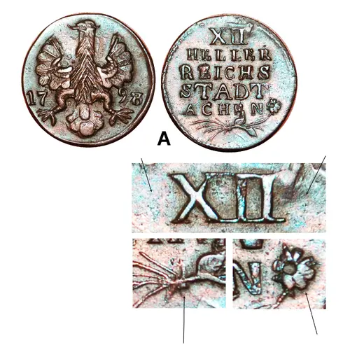 | Reverse lettering | XII HELLER REICHS STADT ACHEN |