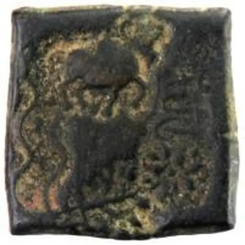 | توضیحات روی سکه | Humped bull, tree-in-railing, river symbol, and the name of the city. |