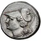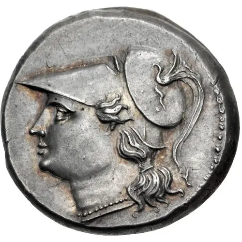 | Beschrijving voorzijde | Head of Athena left, wearing single-pendant earring, necklace, aegis, and crested Corinthian helmet decorated with coiled serpent on the bowl. |