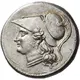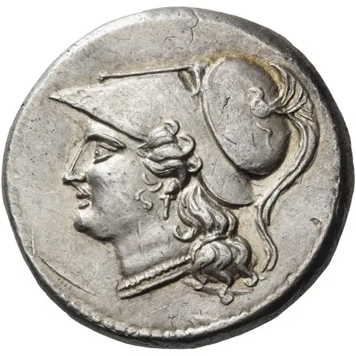 | Popis líce | Head of Athena to left, wearing crested Corinthian helmet with serpent on the bowl, pendant earring and pearl necklace |