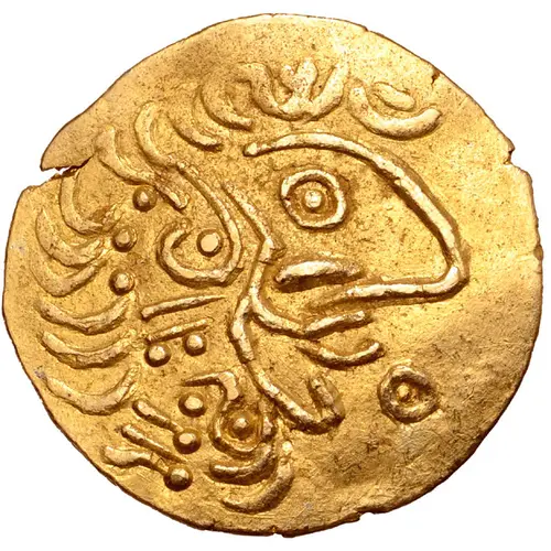 | Описание аверса | Celticised head of Herakles right; pellet within annulet before. |