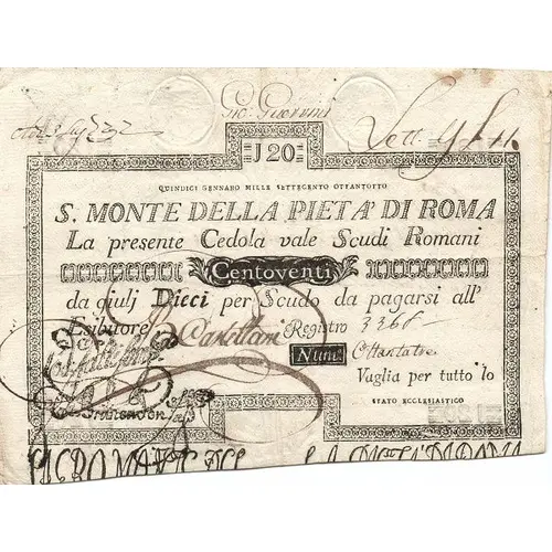 | Obverse lettering | 120 QUINDICI GENNARO MILLE SETTECENTO OTTANTOTTO S. M. DI PIETA DI ROMA La presente Cedola vaglia Scudi Romani Centoventi da giulj dieci per Scudo da pagarsi all` Esibitore. |