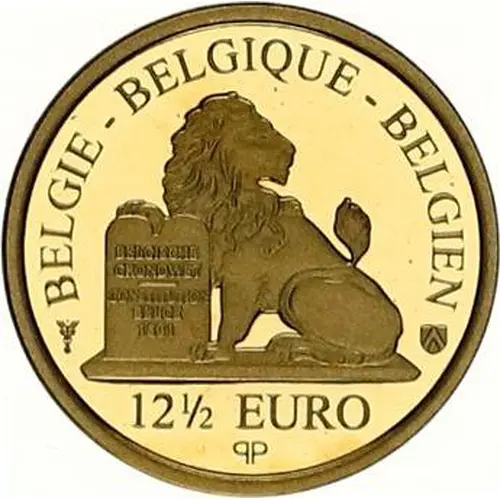 The Belgian lion sitting with its paw overhanging a stele on which are engraved the inscriptions `BELGISCH GRONDWET - CONSTITUTION BELGE`. The inscriptions BELGIE - BELGIQUE - BELGIEN running along the edge of the coin. Under the lion, the value of the coin 121/2 euro and the punch `QP`. |
