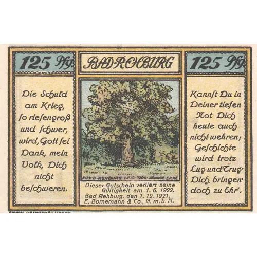 125 PFG. BAD-REHBURG 125 PFG. DIE SCHULD AM KRIEG, FO RIEFENGROB UND ICHWER WIRD, GOTT FEI DANK, MEIN VOLK, DICH NICHT BELCHWEREN. KANNFT DU IN DEINER TIEFEN NOT DICH HEUTE AUCH NICHT WEHREN, GEFOHICHTE WIRD TROTZ LUG UND GRUG DICH BRINGER DOCH ZU EHR. DIESER GUTSCHEIN VERLIERT SEINE GULTIGKEIT AM 1.6.1922 BAD REHBURG DEN 1.12.1921 E.BORNEMANN & CO. G.M.B.H. |
