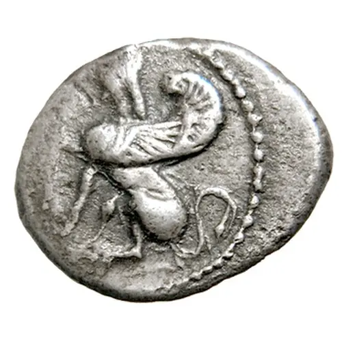 | Ön yüz açıklaması | Seated sphinx facing left. It is raising its right foreleg on an inversed lotus flower. On the left the cypriot syllabic character (=sa). Beaded ring around it. |