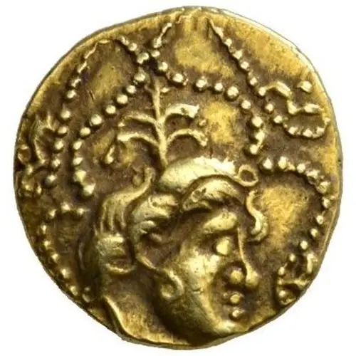 | 正面描述 | Unbearded male head right, plant with four leaves on top of the head; around, strings of pearls. |