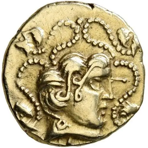 | Aversbeschreibung | Celticized head of Apollo to right, with strings of pearls ending in miniature human heads coming out of his own head. |