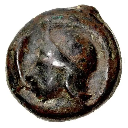 Popis líce Head of Athena in crested Corinthian helmet, facing left vertical dolphin to left