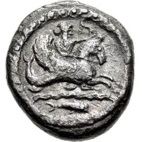 | Obverse description | Melkart, holding bow in extended left hand and reins in right, riding hippocamp right; below, waves above dolphin right. |