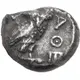 | Descrição do reverso | Owl right, head facing, olive spray and crescent upper left are sometimes visible, ΑΘΕ downwards on right, all within incuse square. These coins were struck from worn, recut, and repolished dies |
