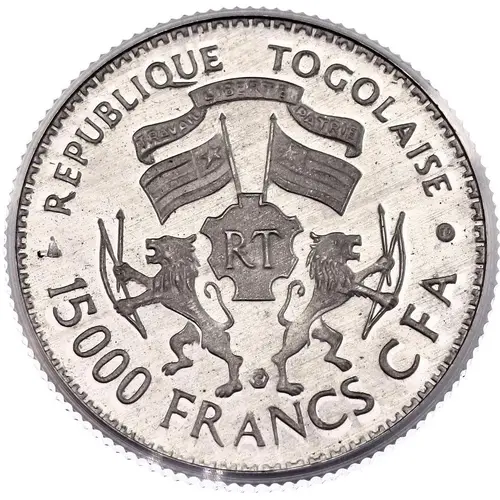 | Obverse lettering | REPUBLIQUE TOGOLAISE TRAVAIL LIBERTE PATRIE RT 15000 FRANCS CFA (Translation: Togolese Republic Labour Freedom Homeland) |