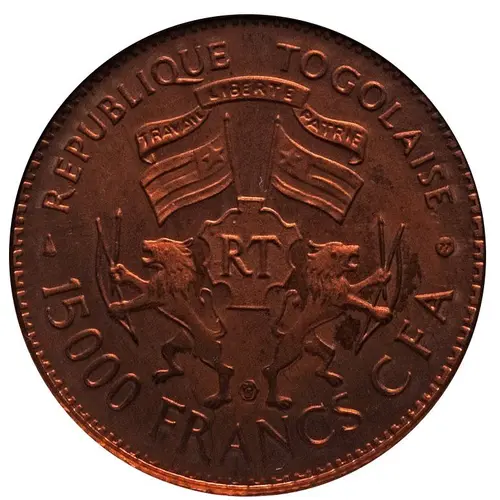 | Obverse lettering | REPUBLIQUE TOGOLAISE TRAVAIL LIBERTE PATRIE RT 15000 FRANCS CFA |