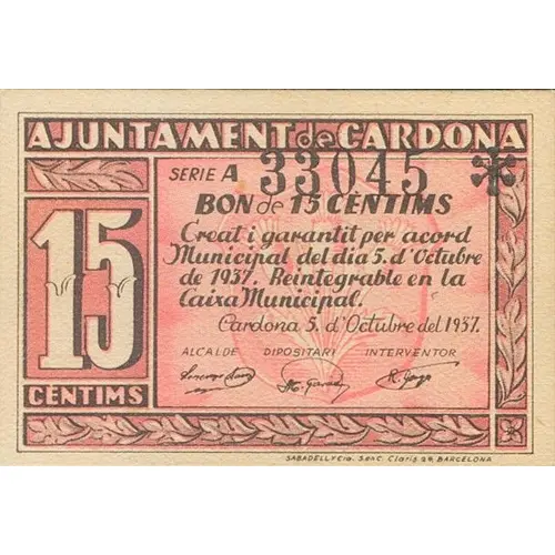 15 CENTIMS AJUNTAMENT de CARDONA BON de 15 CENTIMS Creat i garantit per acord Municipal del dia 5 d`Octubre de 1937. Reintegrable en la Caixa Municipal. Cardona 5 d`Octubre del 1937. (Translation: 15 Centimos City Council of Cardona Bond of 15 Centimos Created and guaranteed by Municipal agreement of October 5, 1937. Refundable at the `Caixa Municipal`. Cardona October 5, 1937.) |