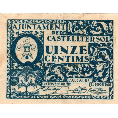 AJUNTAMENT DE CASTELLTERSOL QUINZE CÈNTIMS (Translation: City Council of Castelltersol Fifteen Centimos) |