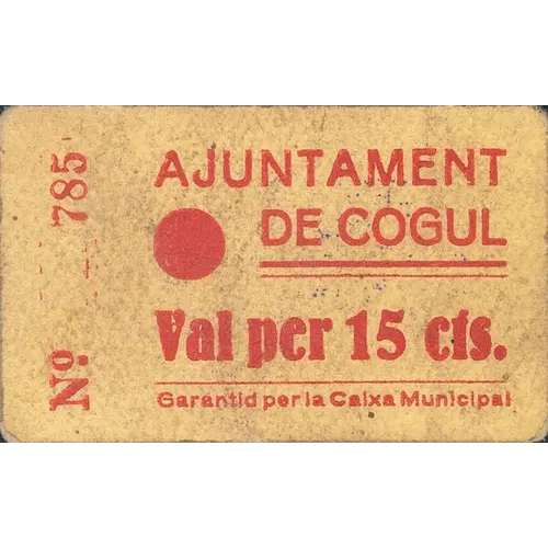 AJUNTAMENT DE COGUL Val per 15 cts. Garantid per la Caixa Municipal (Translation: City Council of Cogul Voucher for 15 Centimos Guaranteed by the Municipal Fund) |