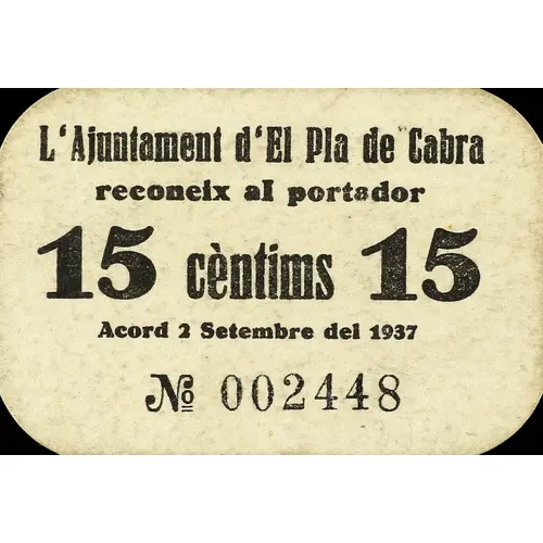 L`Ajuntament d`El Pla de Cabra reconeix al portador 15 cèntims 15 Acord 2 Setembre del 1937 (Translation: The City Council of El Pla de Cabra recognizes to the bearer 15 Centimos 15 Agreement, September 2, 1937) |