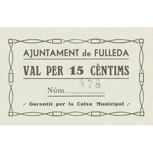 AJUNTAMENT de FULLEDA VAL PER 15 CÈNTIMS Garantit per la Caixa Municipal (Translation: City Council of Fulleda Voucher for 15 Centimos Guaranteed by the Municipal Fund) |