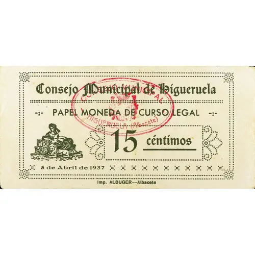 Obverse lettering Consejo Municipal de Higueruela PAPEL MONEDA DE CURSO LEGAL 15 céntimos 5 de Abril de 1937 Imp. ALBUGER - Albacete