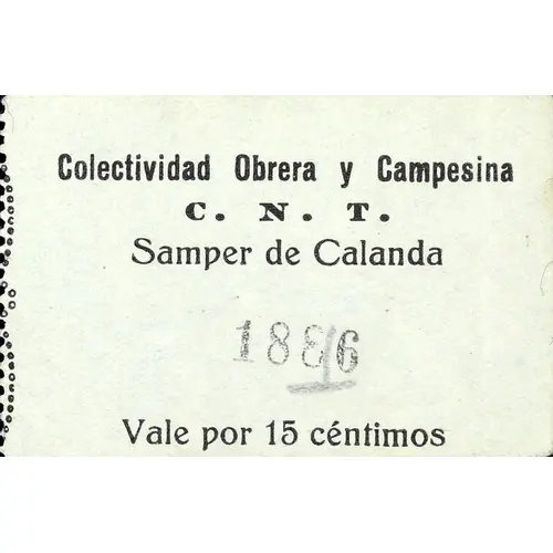 Colectividad Obrera y Campesina C. N. T. Samper de Calanda Vale por 15 céntimos (Translation: Worker and Peasant Collectivity C. N. T. Samper de Calanda Voucher for 15 Centimos) |