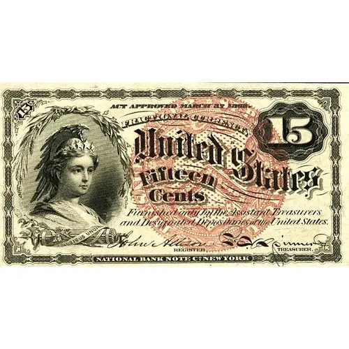 ACT APPROVED MARCH 3rd 1863. FRACTIONAL CURRENCY, UNITED STATES Fifteen Cents Furnished only by the Assistant Treasurers and Designated Depositories of the United States. John Allison (signature) F.E. Spinner (signature) REGISTER TREASURER NATIONAL BANK NOTE COMPANY |
