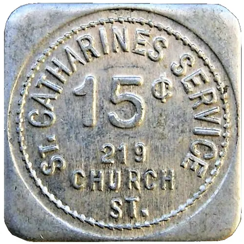 | Obverse lettering | ST. CATHARINES SERVICE 15¢ 219 CHURCH ST. |