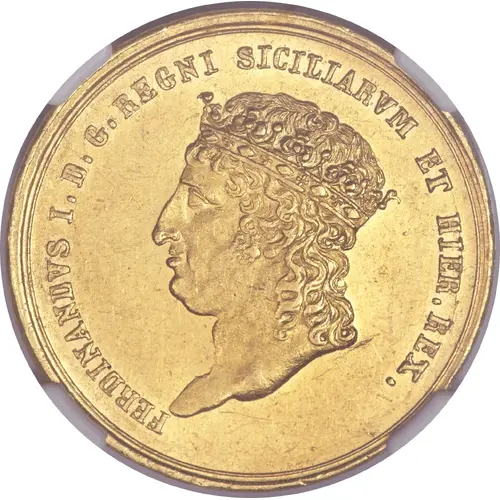 Artistry: This substantial gold piece exemplifies the Neoclassical style prevalent in early 19th-century European coinage. While the specific engraver for this issue is not definitively recorded, the work likely originated from the Royal Mint of Naples. The obverse features a dignified bust of Ferdinando I, typically rendered with classical drapery, while the reverse proudly displays the crowned shield of the Two Sicilies, replete with dynastic arms, symbolizing the unified monarchy. The design conveys a sense of stability and historical legitimacy.