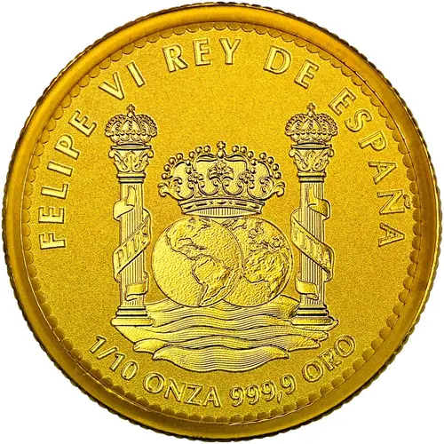 | Opschrift voorzijde | FELIPE VI REY DE ESPAÑA PLUS ULTRA 1/10 ONZA 999,9 ORO (Translation: Felipe VI King of Spain Further beyond 1/10 Ounce 999,9 Gold) |