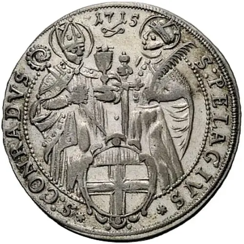 | Obverse description | Saints Pelagius and Conrad behind city arms. |