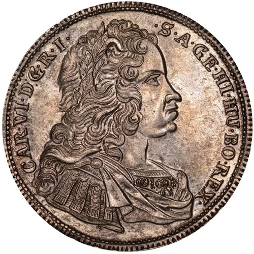 Armoured portrait facing right. Legend (starts 7h) for `Carolus VI Dei Gratia Romanorum Imperator Semper Augustus Germaniae Hispaniae Hungariae Bohemiaeque Rex` |