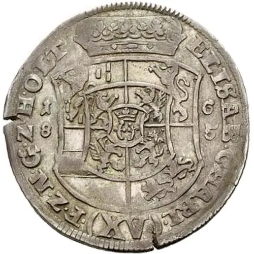 | Obverse description | Crowned 4-fold arms, with central shield within larger 4-fold arms, divide date at 1 - 6/8 - 5, value (XV) at bottom. |
