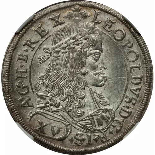 | Descrição do anverso | Portrait with laurel of Leopold I of Habsburg to the right, value in roman digits in a frame below dividing the legend. Legend (starts 1h) for `Leopoldus Dei Gratia Romanorum Imperator Semper Augustus, ac Germaniae, Hungariae, Bohemiaeque Rex` |