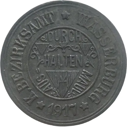 | Obverse lettering | K.BEZIRKSAMT ★ WASSERBURG AUS DURCH MAUL HALTEN ★ 1917 ★ |