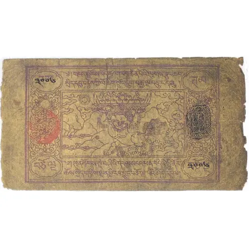 Descrizione del dritto Purple color. Lion with platter of fruit ar center; red stamp at left; black stamp at right. Four text lines.