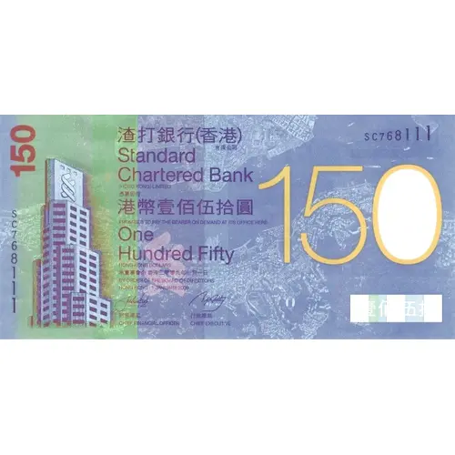 | Obverse lettering | 渣打銀行(香港) Standard 有限公司 Chartered Bank (HONG KONG) LIMITED 憑票即付 港幣壹佰伍拾圓 PROMISES TO PAY THE BEARER ON DEMAND AT ITS OFFICE HERE One Hundred Fifty HONG KONG DOLLARS 承董事會命 BY ORDER OF THE BOARD OF DIRECTORS HONG KONG 1 JANUARY 2009 |