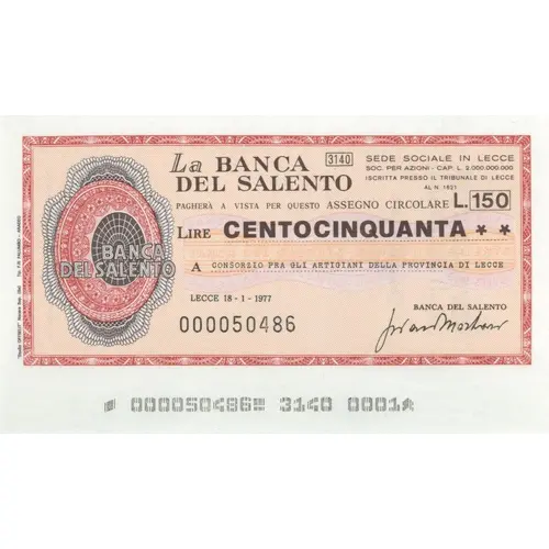 La BANCA DEL SALENTO PAGHERA` A VISTA PER QUESTO ASSEGNO CIRCOLARE L.150 LIRE CENTOCINQUANTA *** A CONSORZIO PER GLI ARTIGIANI DELLA PROVINCIA DI LECCE LECCE 18 - 1 - 1977 |
