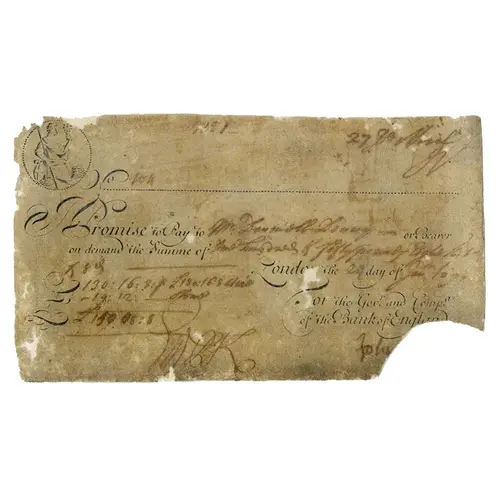 | Obverse lettering | I Promise to pay to _ or Bearer on Demand the Summe of One hundred & fifty pounds Eight /- & 8d - London the 24 day of June 1699. £ For the Governor and Company of the Bank of England |