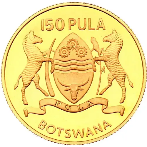 Historical Context: The 1976 150 Pula Independence coin commemorates a decade of self-governance for Botswana, which gained independence in 1966. Issued under President Sir Seretse Khama, this gold coin signifies a crucial milestone in the nation's post-colonial development and stability. Its release also coincided with the introduction of the Pula as Botswana's new national currency, replacing the South African Rand. This period marked a pivotal era of nation-building and economic sovereignty, reinforcing Botswana's identity on the global stage.