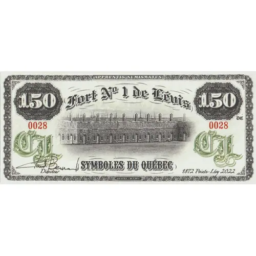 | Obverse lettering | 150 APPRENTIS NUMISMATES FORT No 1 DE LÉVIS CL Claude Bernard DIRECTEUR SYMBOLES DU QUÉBEC 1872 Pointe-Lévy 2022 GRAPHX - QUEBEC |