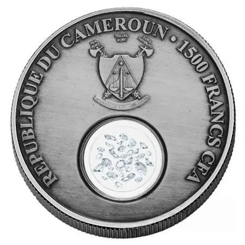 | Obverse description | Coat of arms of Cameroon above diamonds insert. |