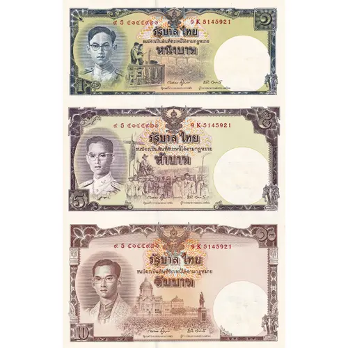 The 1 Baht features a portrait of His Majesty King Bhumibol Adulyadej, the Royal Garuda Emblem, and the Airapote elephant, Portrait of Their Majesties granting an audience to various groups of people who paid their tribute to His Majesty on the occasion on his coronation in 1950 at the Sutthaisawan Prasat Hall. The 5 Baht features a portrait of His Majesty King Bhumibol Adulyadej, the Royal Garuda Emblem, and the Airapote elephant, Portrait of His Majesty in a royal procession by land, marking his 3rd Cycle Birthday Anniversary in 1963. The 10 Baht features a portrait of His Majesty King Bhumibol Adulyadej, the Royal Garuda Emblem, and the Airapote elephant, Portrait of His Majesty granting an audience to various groups of people who paid trubute to His Majesty on the Auspicious Occasion of the 60th Anniversary Celebrations of His Majesty`s Accession to the Throne in 2006 at the Ananda Samakhom Throne Hall. |