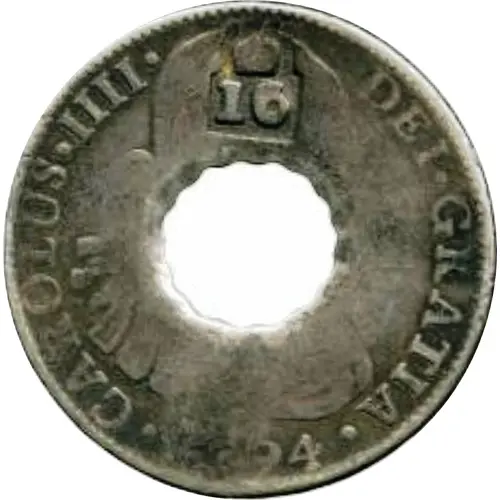 | 表面の説明 | Central circular of 15 crenations cut out on armored bust of Carlos IIII right, dome-shaped counterstamp 16 surmounted by crown above. |