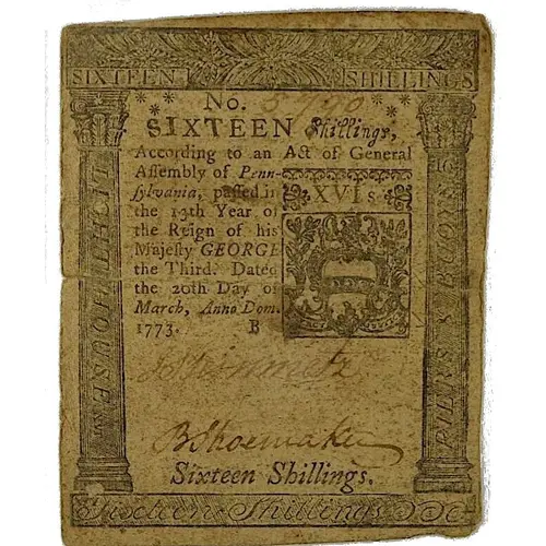 | Obverse lettering | SIXTEEN SHILLINGS SIXTEEN Shillings According to an Act of General Aſſembly of Penn-ſylvania, paſſed in the 13th Year of the Reign of his majeſty GEORGE the Third. Dated the 20th Day of March, Anno Dom. 1773. B Sixteen Shillings |